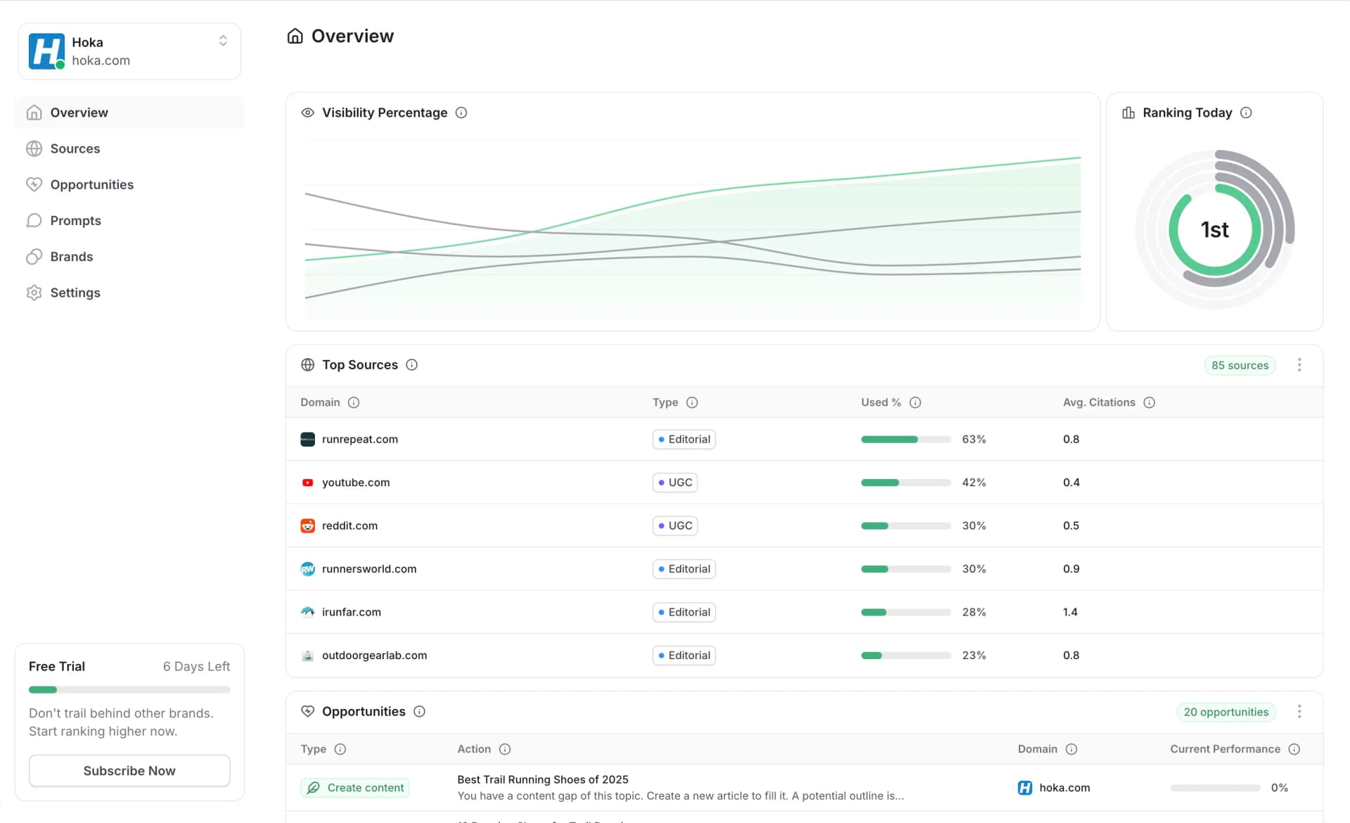 - Citation gap analysis — Discover which sources and domains fuel your competitors' citations, so you know where to focus